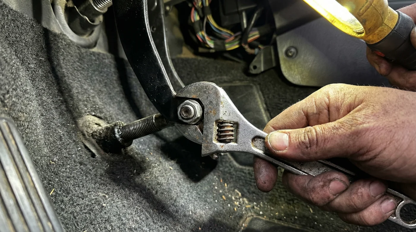 - Encuentra la postura: Deslízate de espaldas en el espacio del conductor, mirando hacia arriba persiguiendo visualmente el brazo metálico del pedal del embrague.