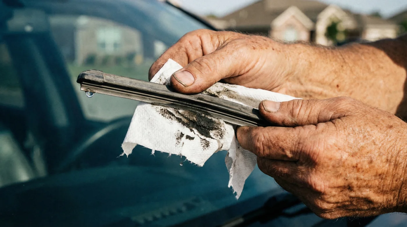 - 1. Limpieza de preparación estructural: Levanta cuidadosamente los brazos metálicos del limpiaparabrisas. Usa un paño ligeramente húmedo para remover el polvo grueso superficial y la arena. No apliques fuerza excesiva todavía para evitar rasgar la goma seca.
