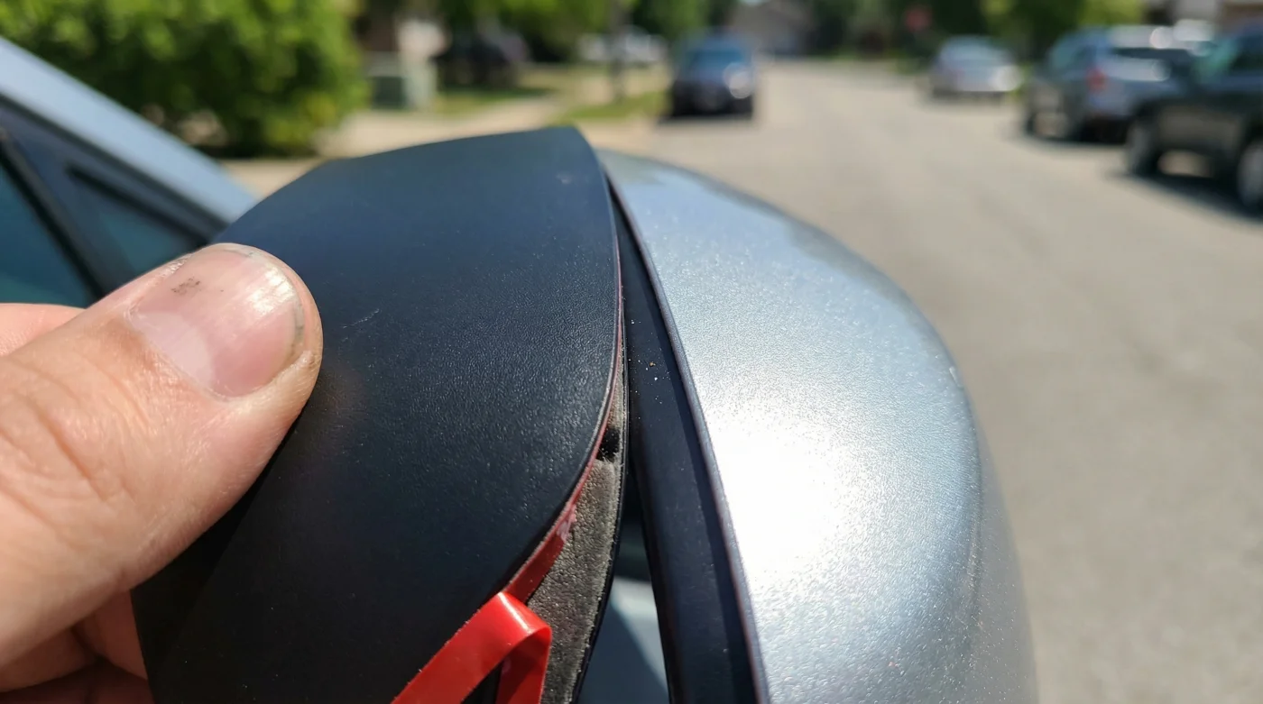 Saca los pequeños deflectores aerodinámicos de su caja. Observarás que el dorso viene con cinta de doble faz preinstalada, usualmente de grado automotriz. Antes de exponer el pegamento, presenta la pieza de acrílico sobre el marco para comprender exactamente su ángulo de anclaje. Una vez que tus manos memoricen la posición, retira el protector rojo de la cinta. Con un pulso seguro, presiona el deflector contra el plástico del espejo.