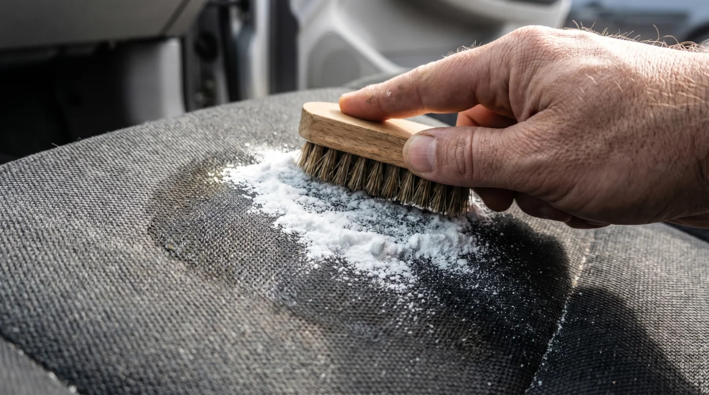 Para los asientos de tela convencionales, debes entender que son esponjas gigantes. Absorben líquidos hasta la base. Aquí necesitas una pasta activa. Mezcla tres cucharadas de bicarbonato con agua tibia (unos 30 grados Celsius, apenas tibia al tacto) hasta lograr una consistencia de crema dental que se adhiera al punto exacto de la mancha sin gotear.