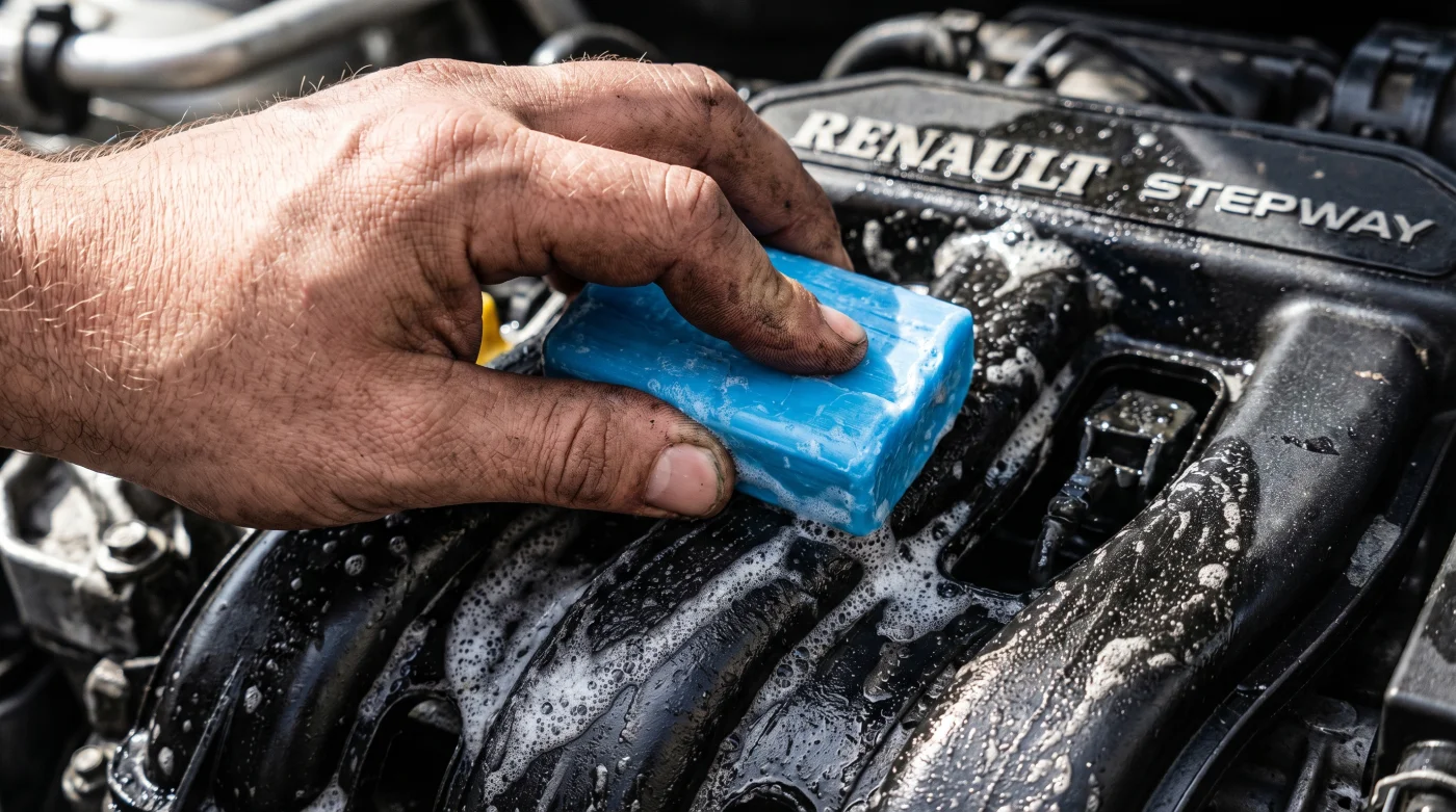 Para el conductor netamente urbano: Si tu Stepway pasa sus días atrapado entre el tráfico pesado de la ciudad o esperando en los semáforos interminables, lo que tienes bajo el capó es principalmente una capa fina de hollín negro y polvo volátil de asfalto. Aquí necesitas una mezcla bastante ligera. Disuelve un puñado de virutas de jabón en dos litros de agua ligeramente tibia. Usa un atomizador común para aplicar y deja que la gravedad haga el trabajo pesado sobre el polvo acumulado.