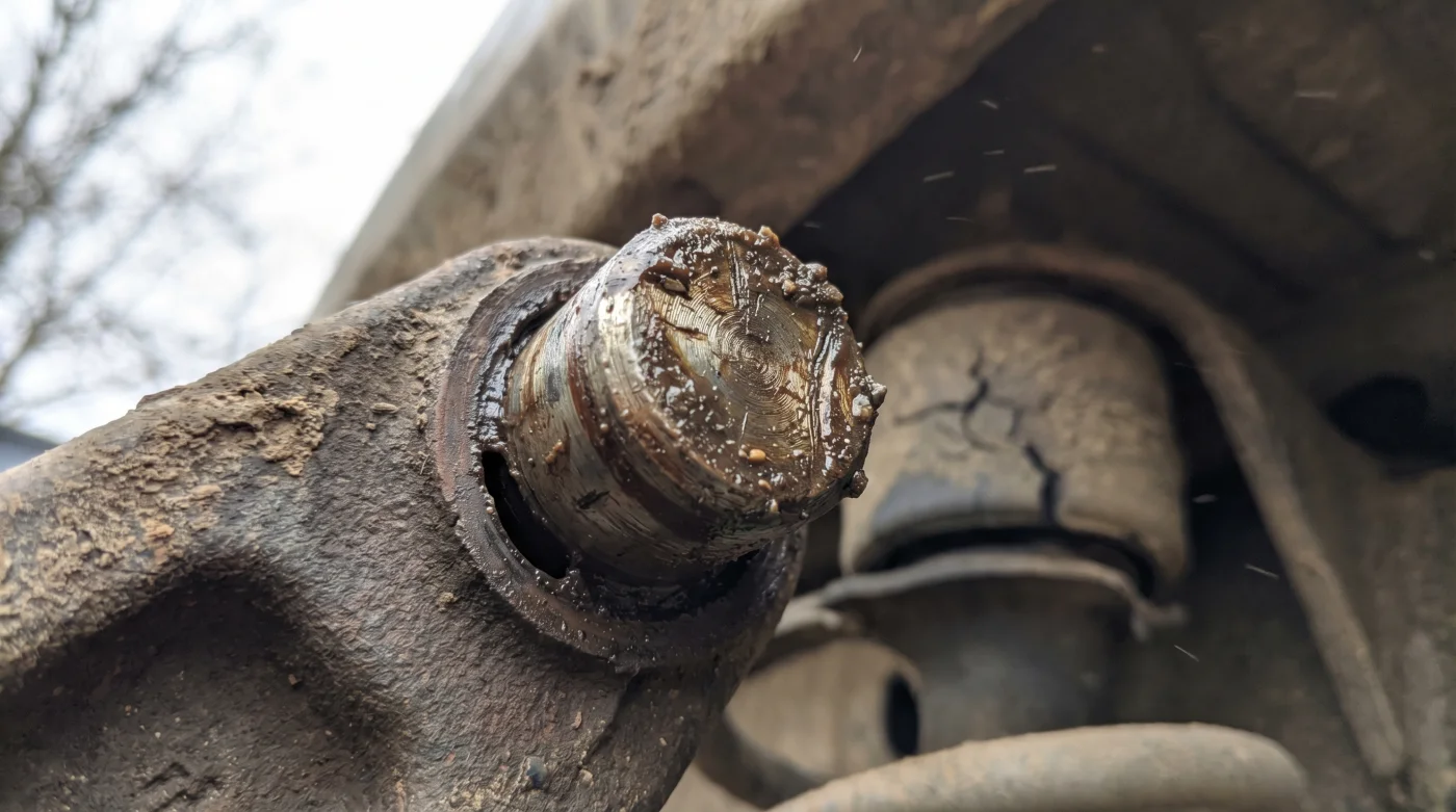 - Utiliza una pistola de impacto o un maneral largo con una copa hexagonal de 14 mm para liberar la presión mecánica. Al sacar el pasador viejo, notarás un sector brillante en el centro causado por la fatiga del metal contra el metal.