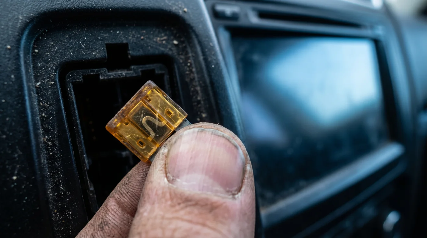 - Localiza el fusible azul de 15 amperios marcado sutilmente como ‘AUDIO’. El plástico transparente central suele estar opaco o tostado por el estrés eléctrico constante de la radio principal.