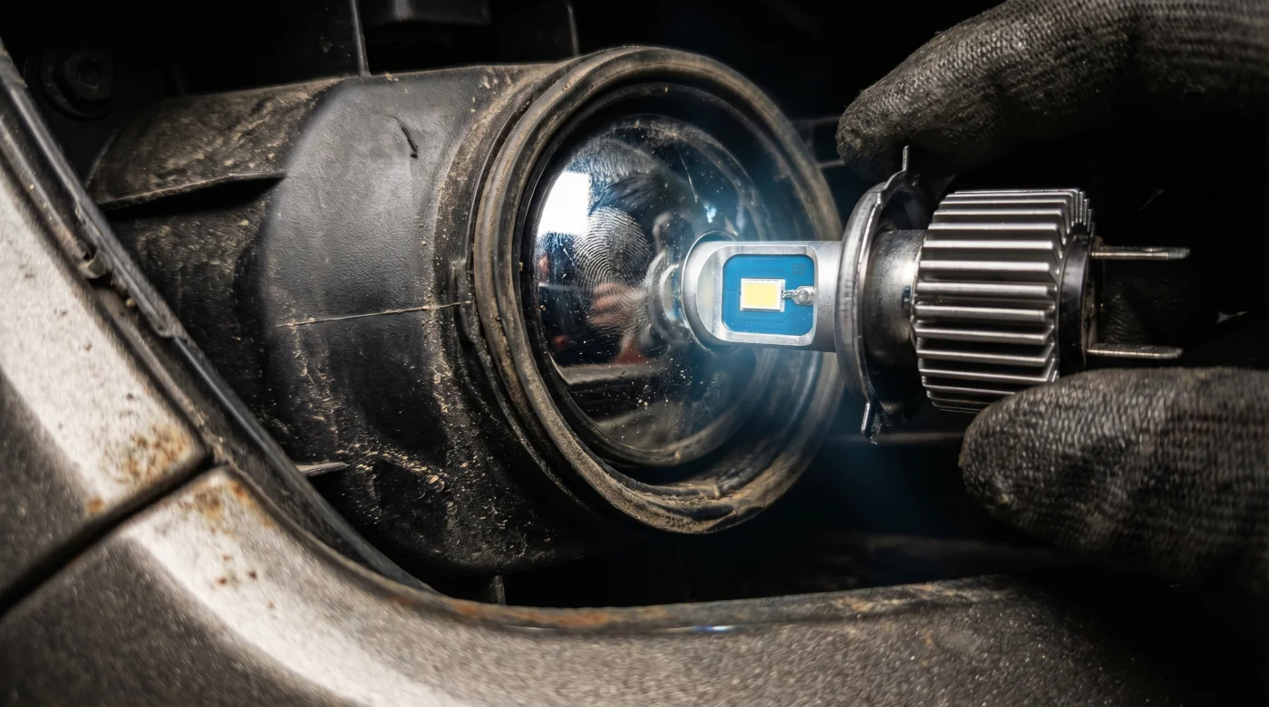 Existe la creencia obstinada de que cambiar un bombillo halógeno amarillento por un diodo de alta intensidad moderniza el auto al instante. Es un error costoso. Piensa en el faro de tu carro como unas gafas graduadas. El reflector está diseñado con precisión milimétrica para rebotar la luz desde un diminuto filamento de tungsteno. Cuando instalas un bombillo genérico, los emisores están en la posición incorrecta. La luz rebota caóticamente dentro de la carcasa, creando un patrón de dispersión que encandila al tráfico en contra pero deja puntos ciegos masivos frente al conductor.