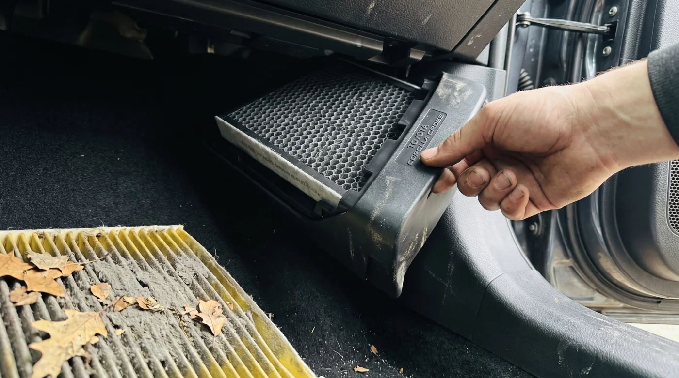 - Identifica el portafiltro rectangular: Justo detrás de la guantera desmontada verás una tapa plástica horizontal. Presiona el clip del lado derecho y retírala con cuidado.