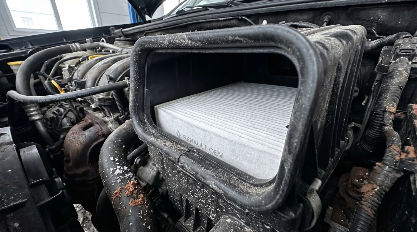 Levantar el capó de una Renault Duster después de cruzar la vía a La Línea a 30 grados Celsius no debería revelar un bloque cubierto de polvo fino y abrasivo. Sientes esa arenilla crujir entre los dedos al rozar la carcasa de admisión. El motor tose ligeramente en ralentí, un sonido áspero que delata una asfixia mecánica crónica. Esa fina capa gris no es solo suciedad de las trochas colombianas; es el residuo de micropartículas de sílice penetrando implacablemente las paredes de los cilindros. Un repuesto genérico comprado por 30.000 pesos está permitiendo que tu vehículo trague papel lija kilómetro a kilómetro.