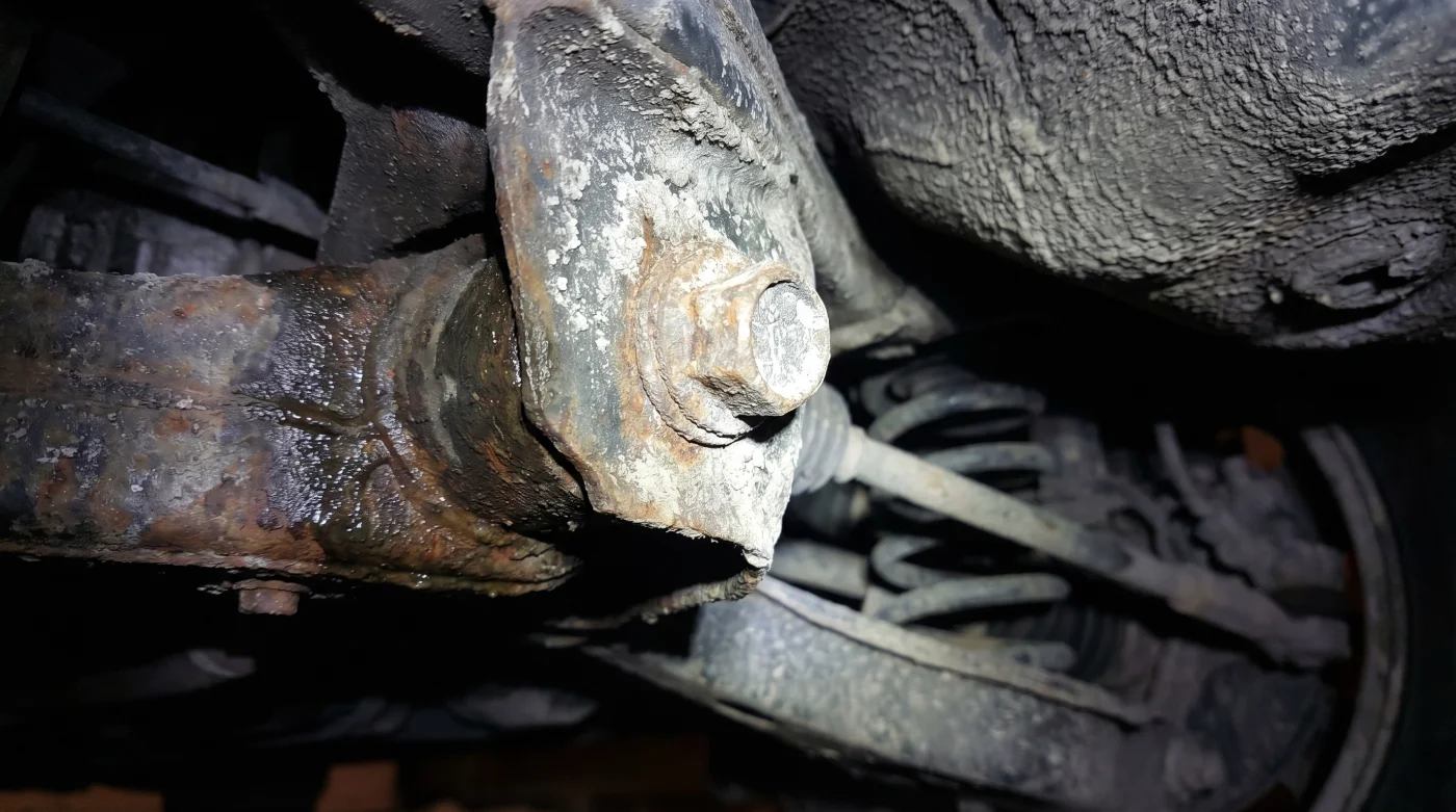 1. Ubica el sector frontal: Acuéstate debajo de la rueda del lado del pasajero. El despeje natural al suelo de esta camioneta es suficiente para operar la herramienta sin usar gatos hidráulicos o soportes especiales.