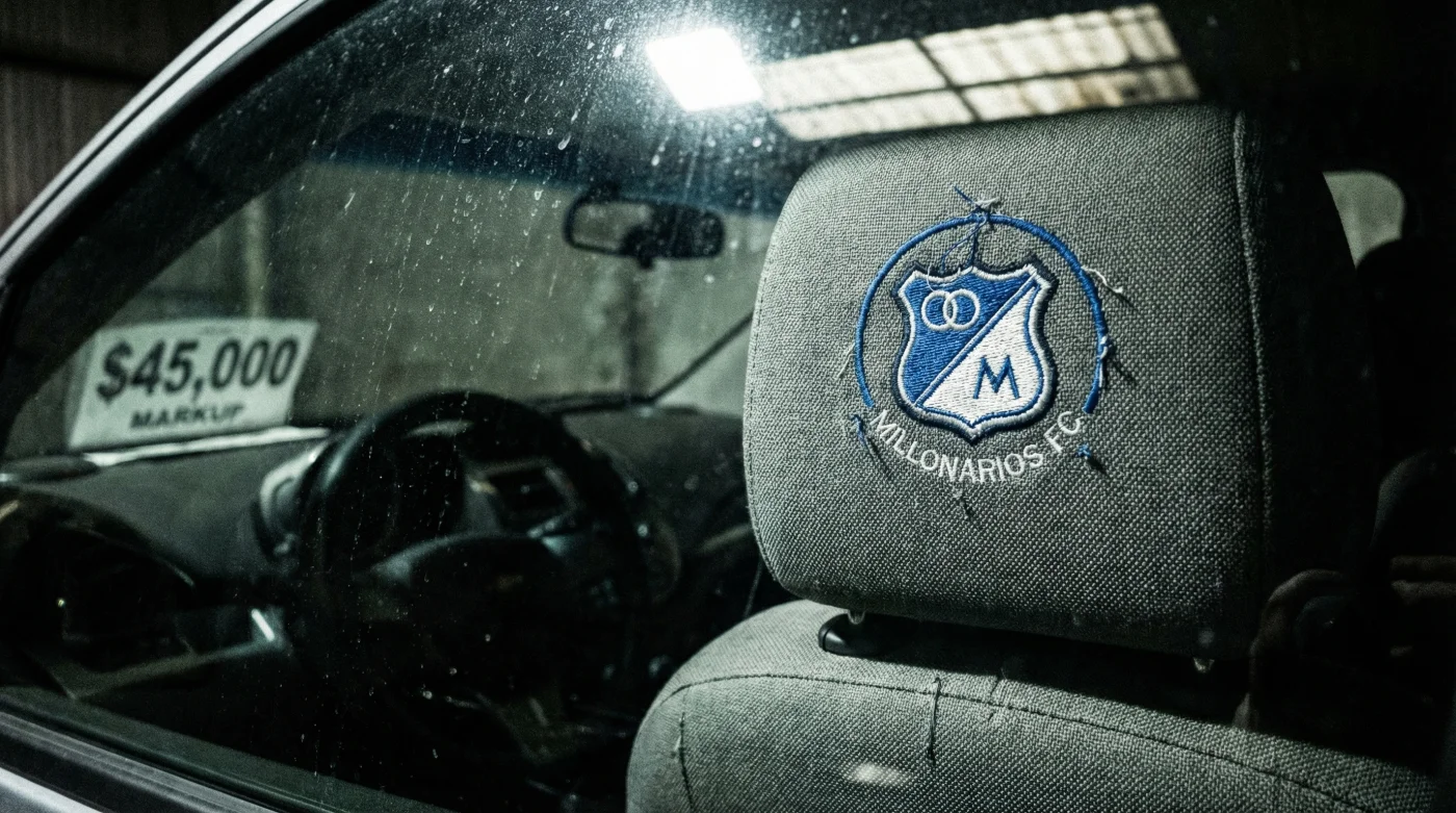 La fotografía, tomada desde un ángulo bajo y con escasa luz, revela un azul profundo metálico, un tono que rompe con la paleta regular ofrecida en Colombia. Los asientos muestran un tapizado mixto donde el hilo azul celeste cruza los paneles, culminando en un escudo bordado con precisión milimétrica en el apoyacabezas. Es un romance visual innegable, pero detrás de esa seducción de tela se esconde una estrategia de precios agresiva que aprovecha el fervor irracional de la hinchada para engordar el margen de ganancia corporativo.