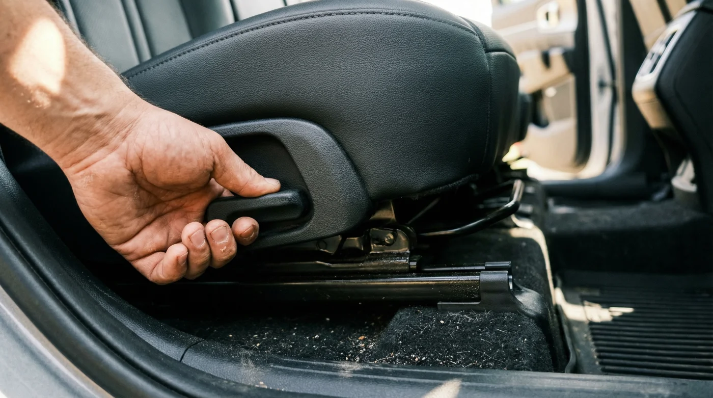 Primero, abre la puerta trasera izquierda y desliza tu mano por el borde inferior de la segunda fila, justo en la frontera donde el tapizado premium se encuentra con la alfombra del suelo.
