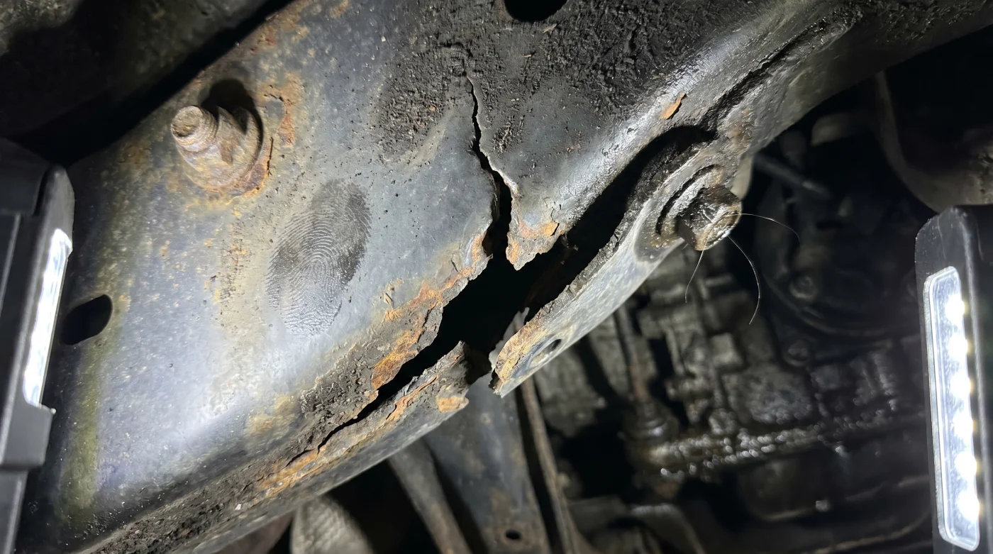 • Busca signos de pintura descascarada o polvo de óxido alrededor de los gruesos tornillos del subchasis; es el primer síntoma de flexión excesiva de la lámina.