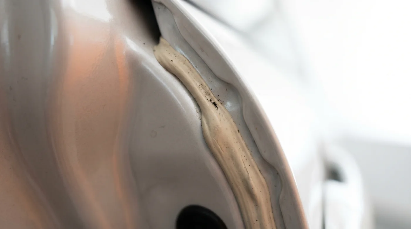 Aquí entra en juego el cordón de sellado. Cuando este modelo se ensambla, brazos robóticos aplican un polímero de fábrica a lo largo de las uniones de las puertas, el capó y el baðl. Es un trazo fluido, denso, firme y visualmente constante.