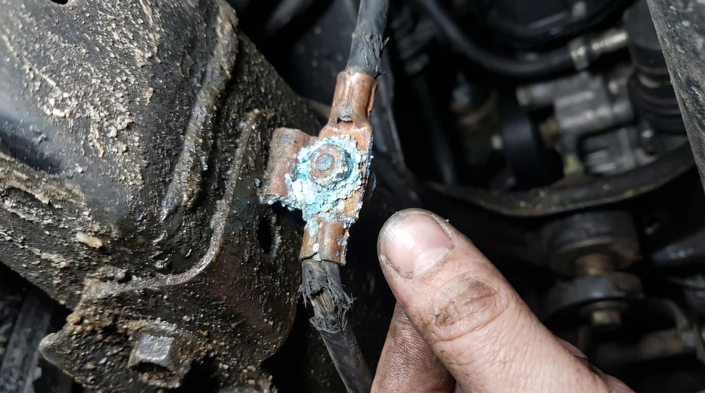 Esa humedad constante, mezclada con los gases normales que emite la batería bajo el capó, genera esa temida sulfatación verdosa. El primer síntoma para ti será una radio que se reinicia sola en los semáforos o ventanas que suben con lentitud agonizante cuando accionas los botones de la puerta.