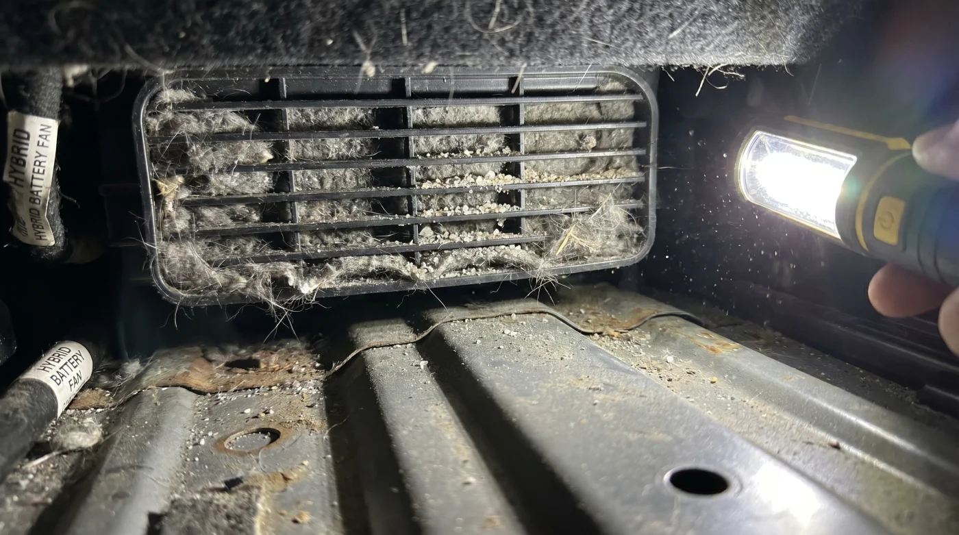 Probablemente ingresó polvo compacto al ventilador de enfriamiento durante la limpieza intensa de los asientos traseros, causando un sobrecalentamiento rápido de las celdas.