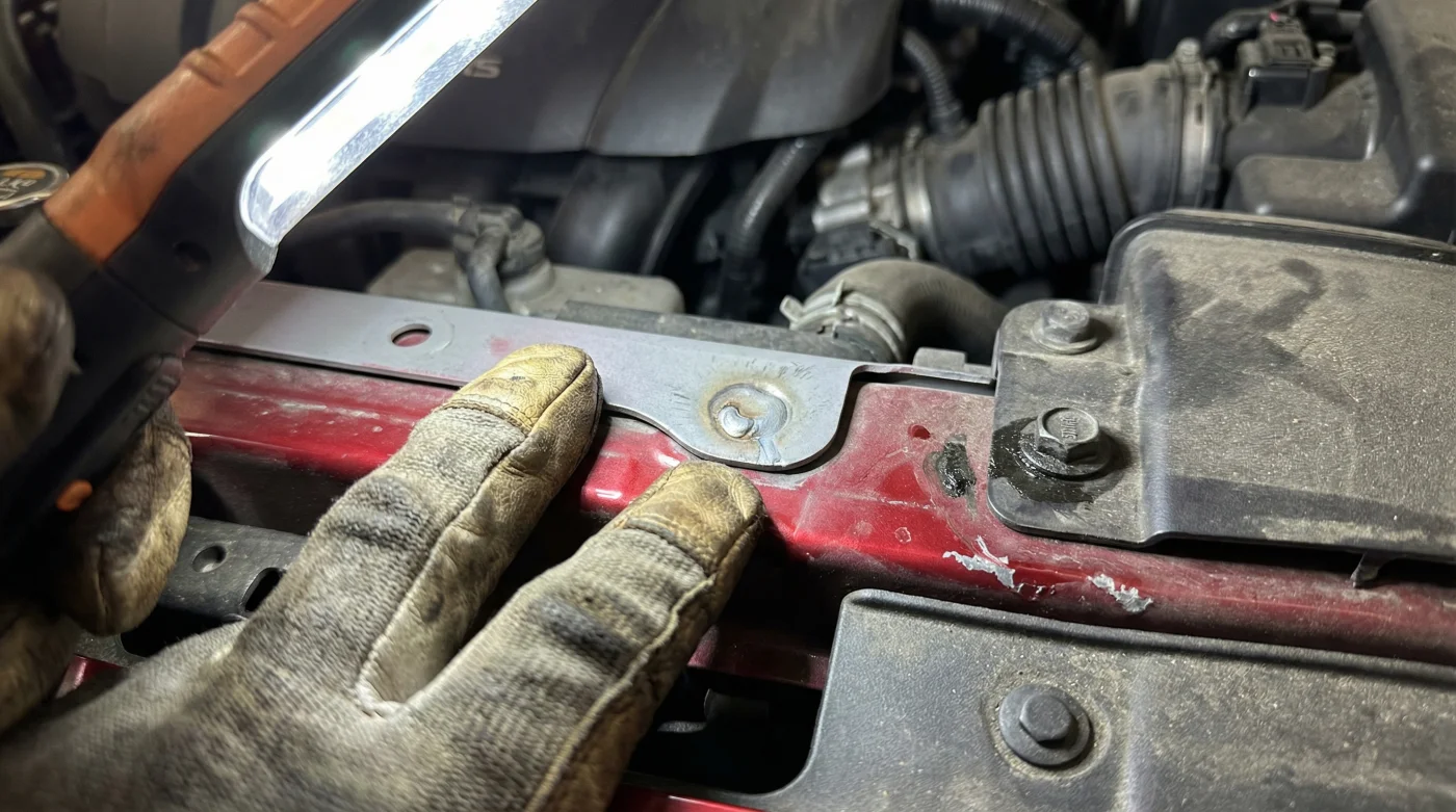 Cuando una CX-30 sufre un choque frontal severo, este soporte se dobla irremediablemente. Para repararlo barato y venderlo rápido, los talleres de dudosa reputación lo enderezan a la fuerza, o lo cortan y sueldan uno de reemplazo usando soldadura MIG convencional. Luego, intentan disimular el desastre pintando la zona con aerosol.