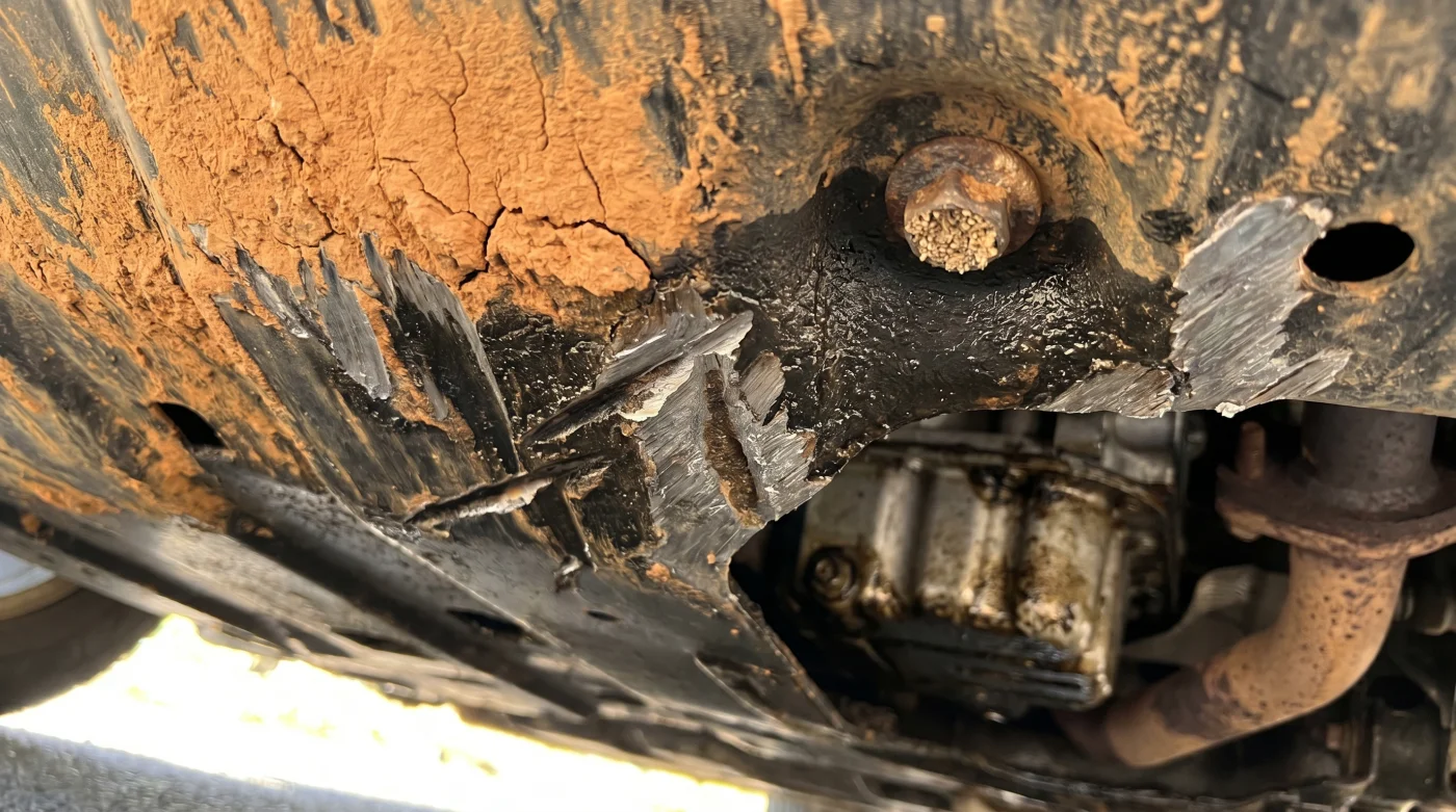 Si notas este patrón específico, el riesgo financiero se multiplica. El esclavo de la flota minera es el caso más peligroso de todos. Parecen verdaderas gangas porque las empresas las rematan rápido tras un par de años de uso intensivo. La placa del cárter no solo está rayada en todas direcciones, sino que suele estar cubierta por una fina capa de barro rojizo que se horneó y solidificó con el calor intenso del bloque del motor.