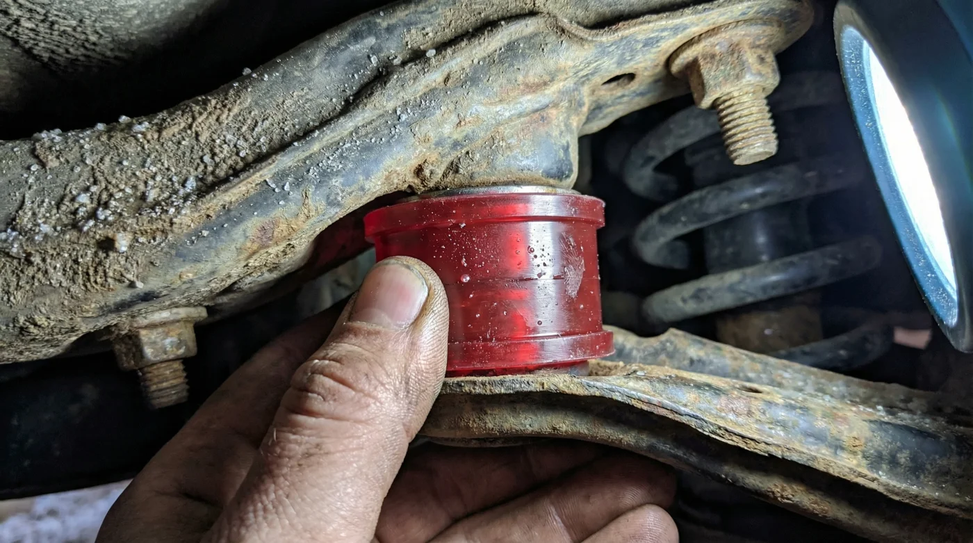 Una vez el orificio está libre y reluciente, se lubrica el nuevo componente. Este buje de poliuretano es mucho más denso y rígido que el caucho original de fábrica. Entra a presión milimétrica, sellando el espacio de forma definitiva y creando una articulación firme. Al atornillar todo en su lugar, aplicar el torque correcto y bajar la camioneta, el cambio es rotundo.